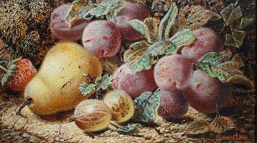 Still life of plums, gooseberries, a pear and a strawberry on a mossy bank