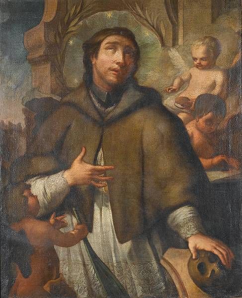 Saint Francis in meditation holding a skull and surrounded by three putti