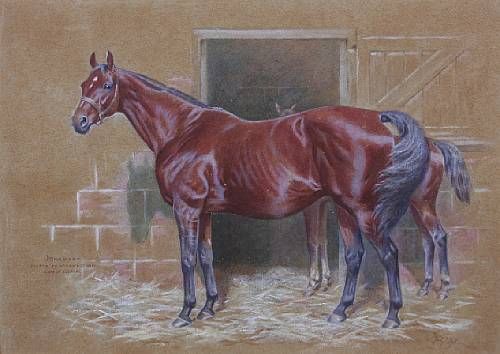 A thoroughbred mare, 'Ornament, sister to Ormonde and dam of Sceptre', with foal behind
