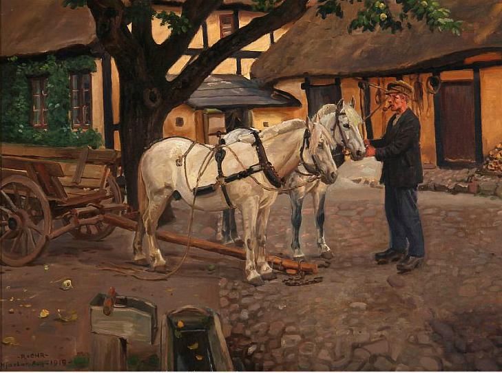 A farmer with two Norwegian horses in a farmyard.