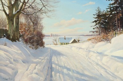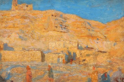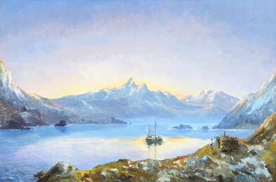 Sunset scene from Greenland with people waiting for a ship to arrive.