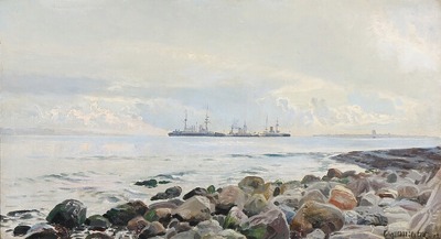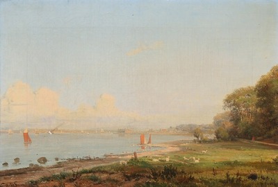 Coastal scene with grazing sheep, in the background Kronborg Castle