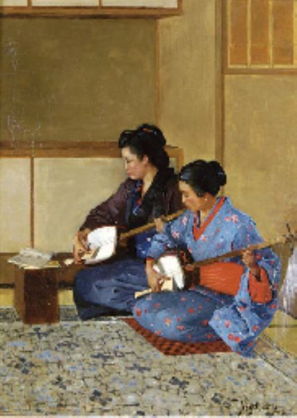 Goldfish in a bowl on a ledge beside cherries and other fruit and flowers