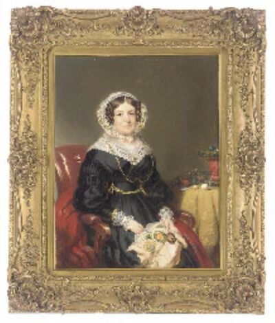 Portrait of a lady, half-length, in a black dress and lace bonnet, with roses in her right hand
