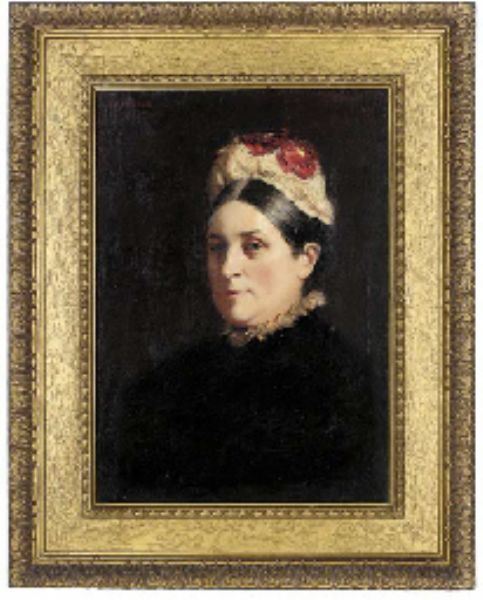 Portrait of Eliza Horne, bust-length, in a black dress with red flowers in her hat