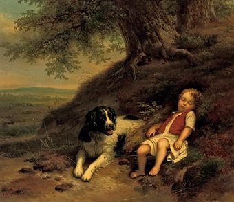 A boy resting with his dog, in a landscape