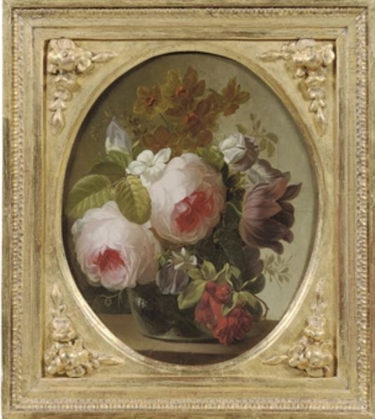 Pink roses, jasmine, a tulip and other flowers in a glass vase on a ledge