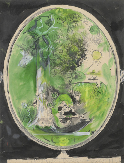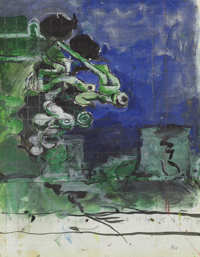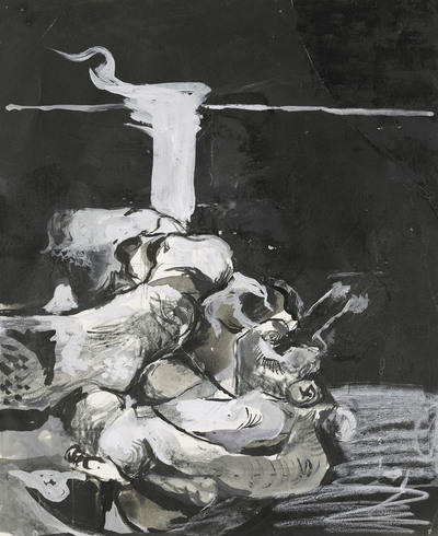 Gouache ink, chalk and pencil on paper, lightly squared for transfer