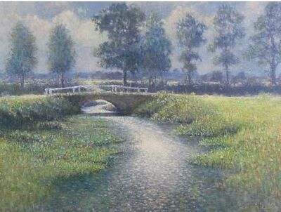 rocky river landscape with a bridge and lodge and mountain in the distance