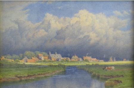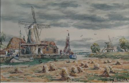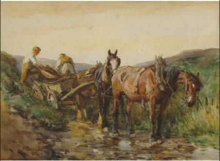 workers loading a horse drawn cart and a triple horse drawn cultivator with figure