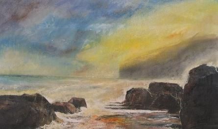 Sunrise at Reighton Gap sun rising onto Filey Bay over Bempton Cliffs luring sea mist away