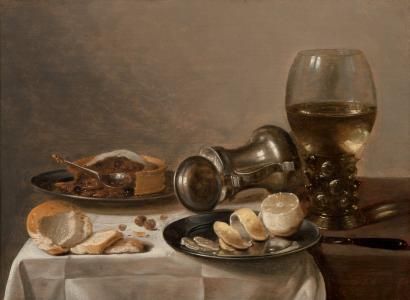Nature morte au verre römer, citron et la tourte