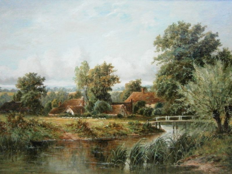 River scene with cottage and cattle