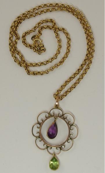 A yellow metal pendant set with a peridot and a purple gem on a 9ct chain