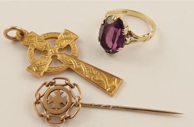 A 9ct engraved Celtic cross, a 9ct gem set ring and a 9ct Maltese cross tie pin weight approx 11.7gms
