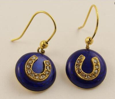 A pair of yellow metal horseshoe earrings set with rose cut diamonds on a blue enamel drop