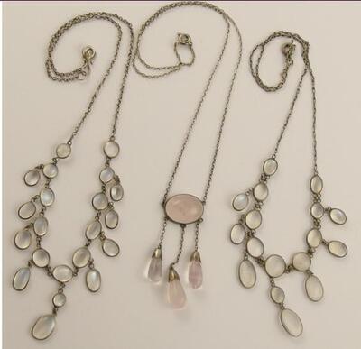 Two moonstone festoon necklaces and a rose quartz pendant necklace all in un-hallmarked white metal