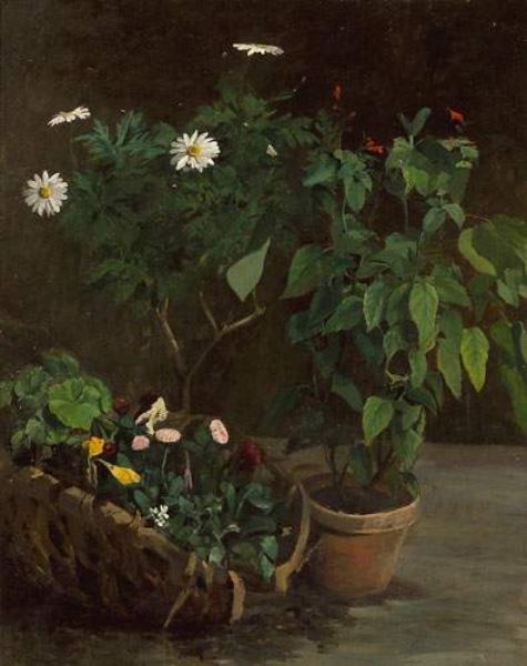 Nature morte sur un entablement, pain, deux bouteilles et verre, jambon, vase de fleurs, coupe” étrusque “et rose.
