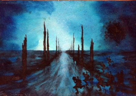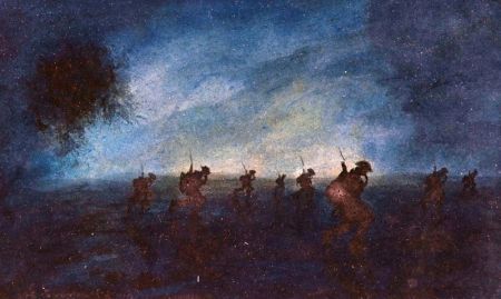Nocturnal Battlefield with Soldiers Wearing Gasmasks