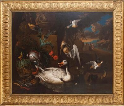 WILD FOWL WITH LANDSCAPE AND FIGURES