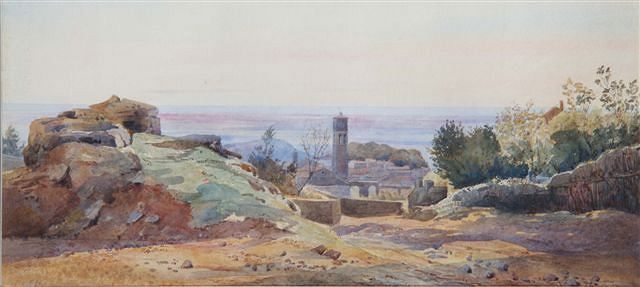 a rocky headland, Bay of Naples with mount Vesuvius erupting in the distance