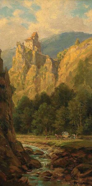 Malerische Flusslandschaft mit Ruinenhügel, alter Mühle und zahlreicher Figurenstaffage