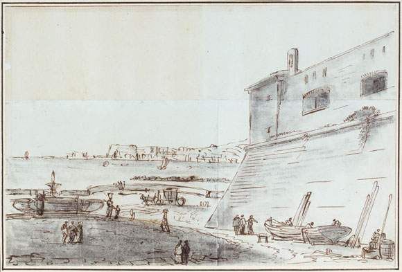 Vue animée du bord de mer à Naples, au pied d'un bastion, autre vue