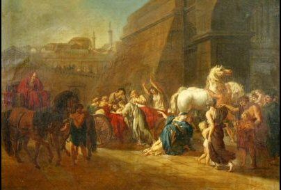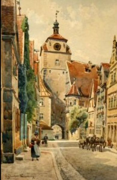 Oberwesel Schloss am Gebirgsfluss mit heimkehrenden Landsknechten