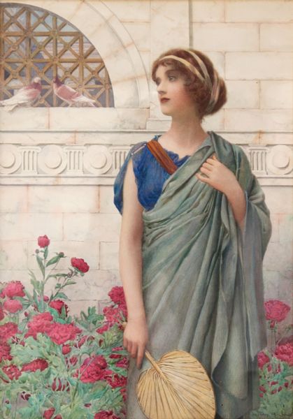 Klassiserande kvinnogestalt med solfjäder i omgivning av pioner och duvor.