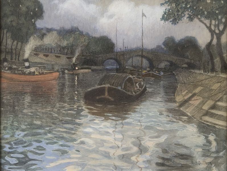 Romantiserat landskap från Dalarna med fors, sågverk och fiskare.