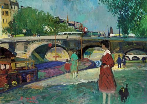 EUGÉNIE ET LE CHIEN RIGÓ DEVANT LES PÉNICHES DU PONT NEUF