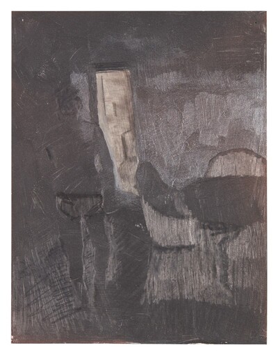 Enamel varnish and tinted enamel on canvas board, mounted to wood